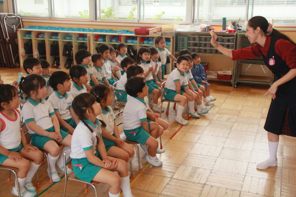 常勤のネイティブスピーカーの教師が、遊びの中で自然に英語に親しめる時間《E-たいむ》を設定しています。また、設定保育以外でも、子どもたちと活動を共にしながら英語で話しかけ、英語にふれる機会をできるだけ多く持てるよう、環境を整えています。